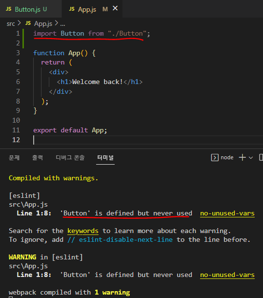 그러고 App.js에 아래와같이 import로 Button을 가지고 오면콘솔창에 아래와 같이 경고창이 뜨는데, 이것이 create-react-app의 우리를 도와주는 기능 중 하나라고 생각하면 된다.