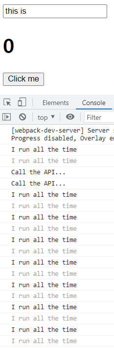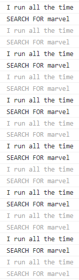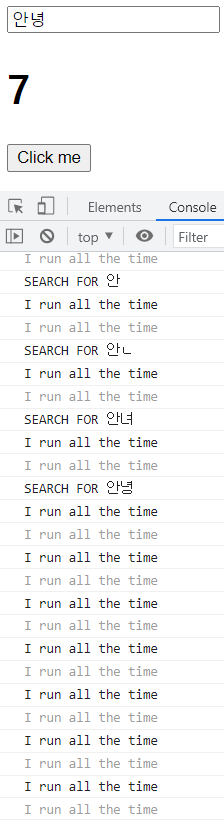 다음과 같이 marvle을 입력했을때, 모든 문자 하나씩 입력할때마다 이 콘솔과 I run all the time까지 계속 출력해내는것을 볼 수 있다.