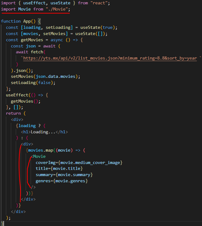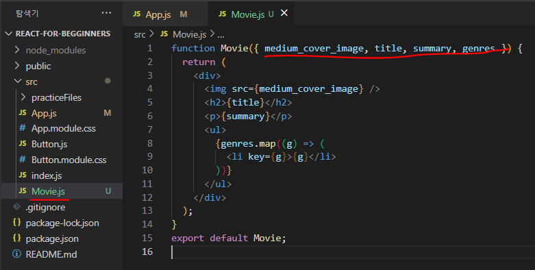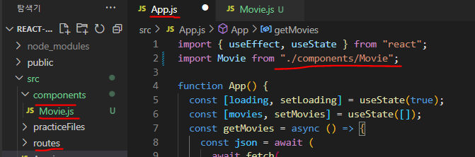 그럼 Movie.js를 components안에 넣고, App.js안에 있는 Movie의 경로도 바꿔보자.