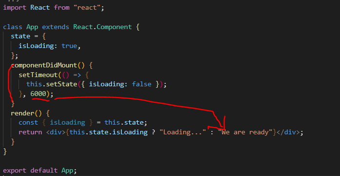return <div>{this.state.isLoading ? "Loading" : "We are ready"}</div>;