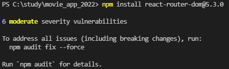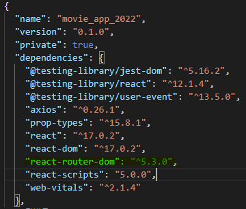 오류를 해결한 뒤라 "react-router-dom": "^5.3.0"으로 되어있지만 원래는 6버전이었다.