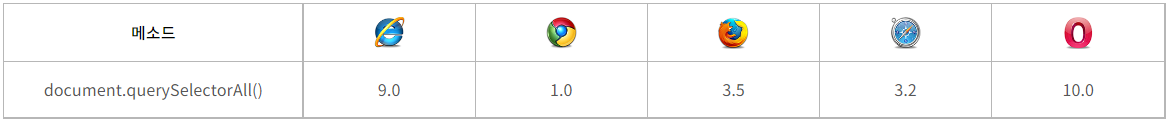 document.querySelectorAll() 메소드를 지원하는 브라우저별 지원 여부는 다르다. 아래와 같다.