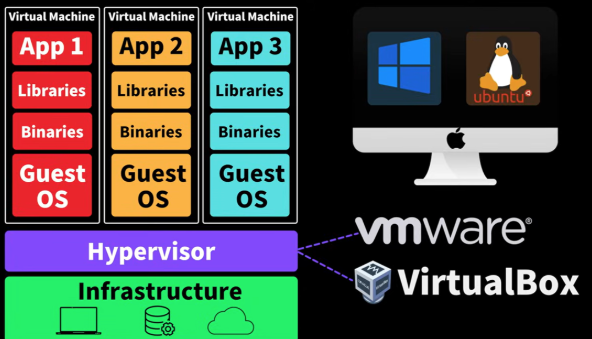 하드웨어 Infrastructure 위에 VMware, Virtual Box와 같은 Hypervisor 소프트웨어를 이용해서 각각의 가상머신을 만들 수 있음