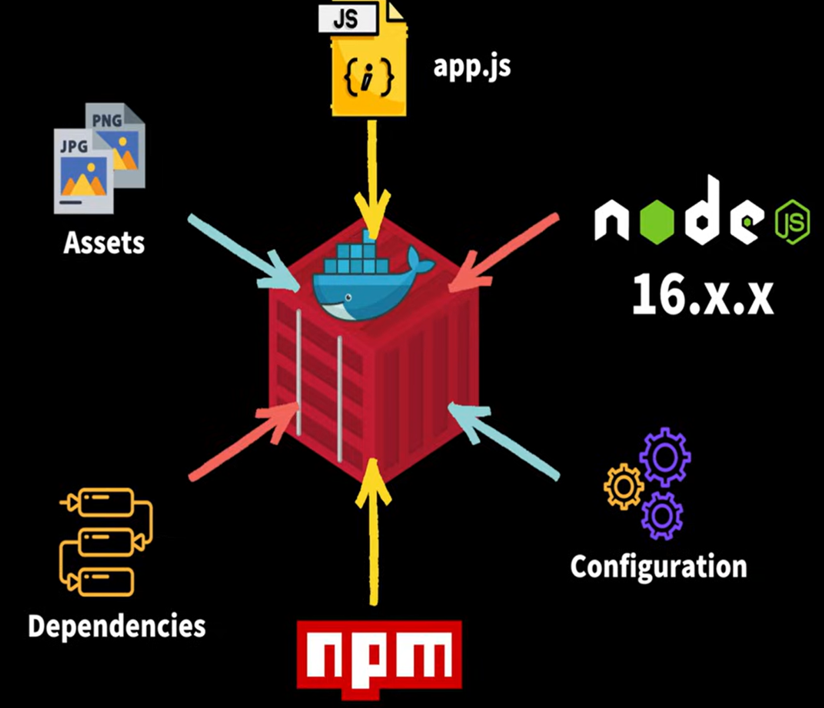 Docker Container안에는 Application, Node.js, 환경설정, npm, 여러 라이브러리의 dependencies, application에 필요한 다양한 리소스 들이 포함될 수 있음