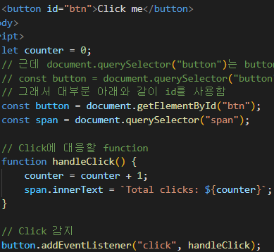 vanilla.html에 있는 button을 가져와서 addEventListener를 붙이고 listener function을 만들어보자.