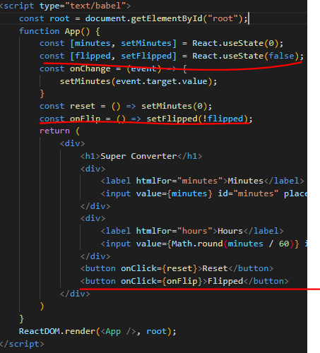 버튼을 클릭하면 onFlip함수가 가동이 되어 현재값을 반대 값으로 조정해주어
